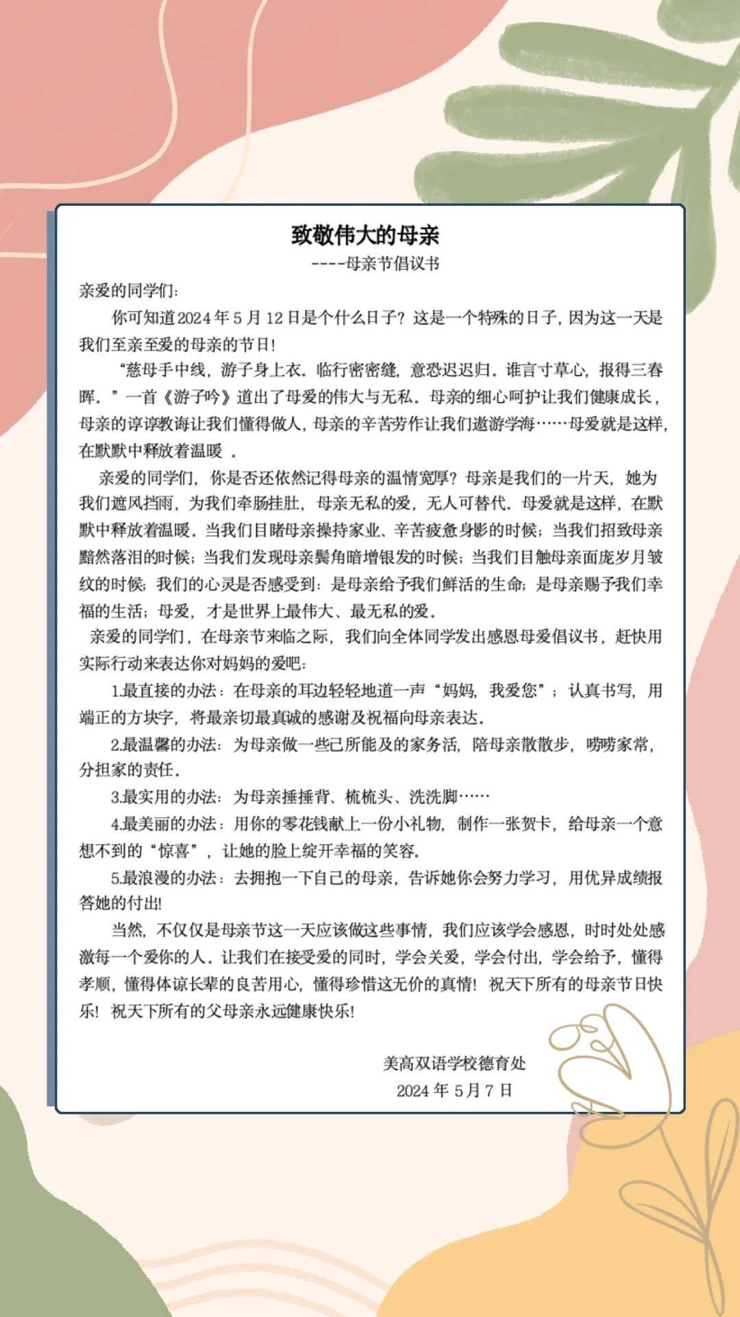 感恩教育一直是美高双语学校所注重的德育教育。旨在培养学生们爱亲人、爱社会的情感。在母亲节来临之际,美高双语学校开展了“母亲节”主题教育活动。活动以“致敬,伟大的母亲!”为主题,让孩子们了解母亲的工作、爱好及艰辛,帮助妈妈做力所能及的事来感恩母亲。