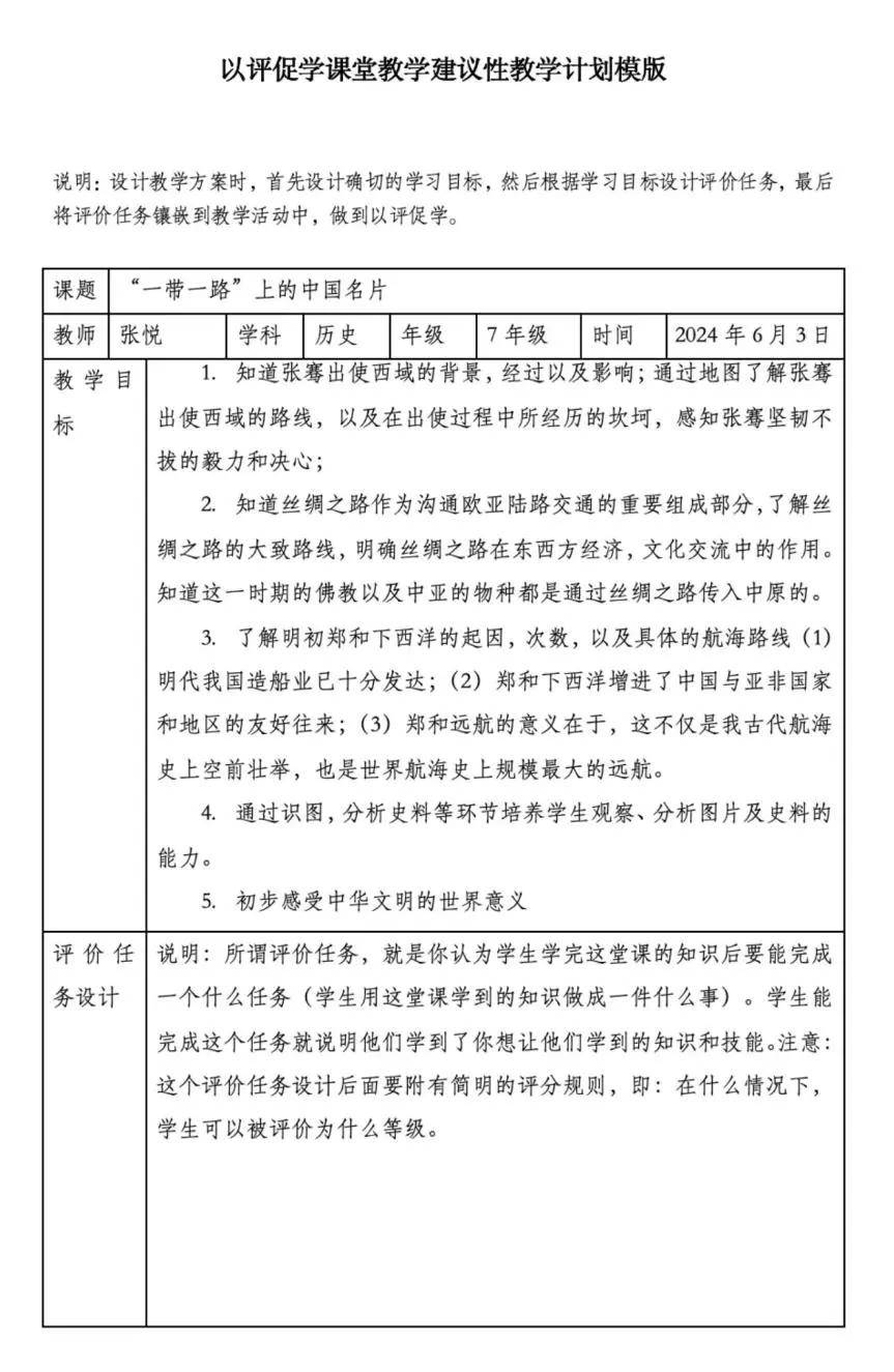 2.张悦老师这堂课,很鲜明地分为三个板块,一是“一带一路的人物名片”,一是“一带一路的城市名片”,一是“一带一路的文物名片”,实际上就是分别从人物、城市、文物三个方面,讲“一带一路”的历史脉络。从课堂结构来说,是非常清晰的。在教学过程中,张悦老师每一个环节,都为学生提供了一个“任务单”,通过让学生填表的方式,让学生在课堂里有事可做,让学生动起来了。总的来说,张老师这堂课,较好地达成了教学目标。