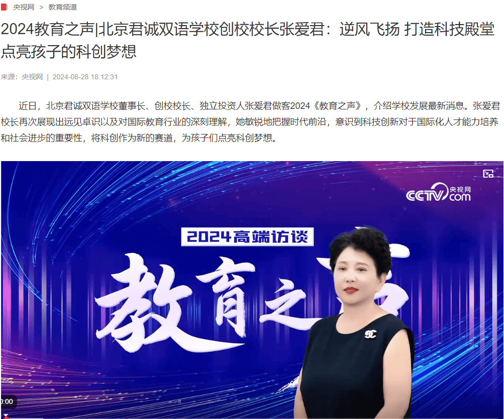 关于这所大楼,君诚国际双语学校董事长、创校校长及独立投资人张爱君还应邀做客2024《教育之声》节目,就科创大楼的投入使用事宜及学校发展的最新动态进行了详细介绍,被央媒报道。在此次访谈中,张爱君校长再次彰显了其卓越的远见和对国际教育领域的深刻洞察。