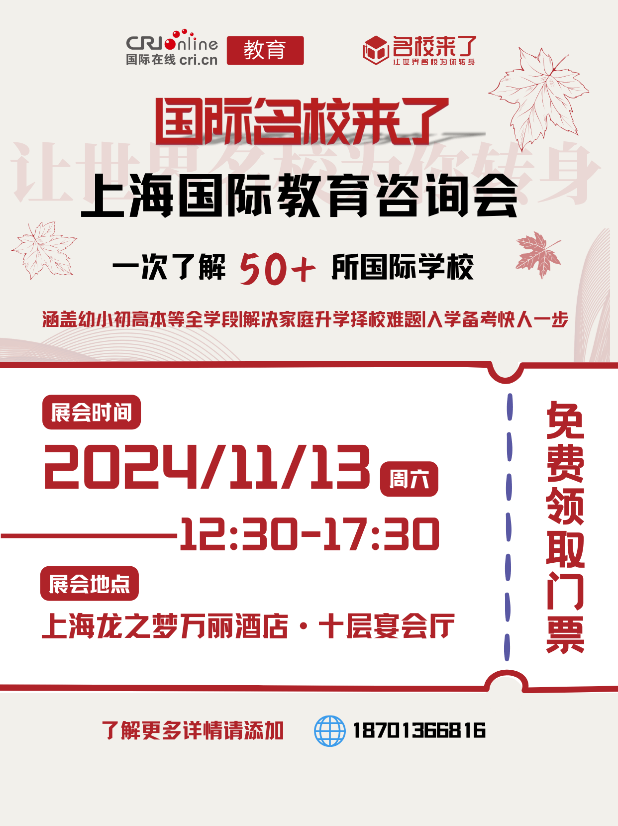2024年11月3日(周日)由国际在线教育频道、名校来了和创世蓝海联合主办的第十五届国际教育择校咨询会在上海梦之龙万丽酒店隆重举办!