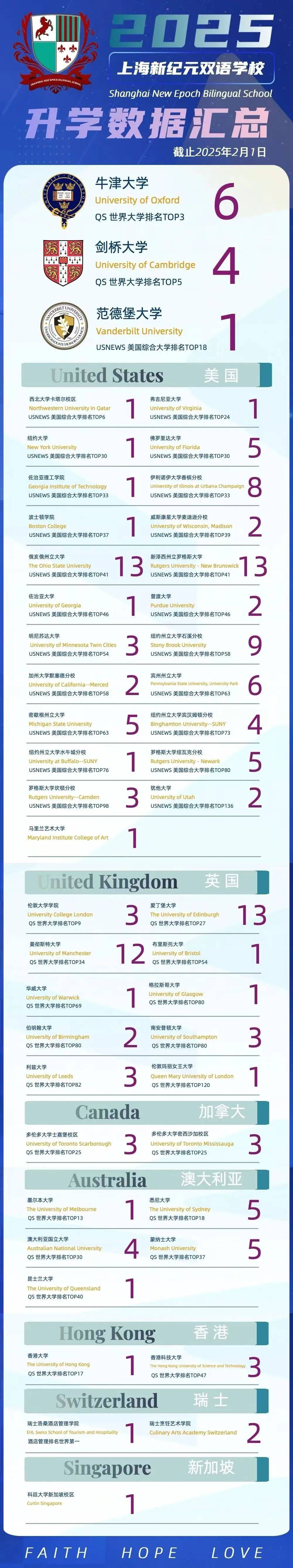 上海新纪元双语学校 受邀出席2025年3月30日 上海第十九届国际教育择校咨询会 相约上海 —让世界名校为你转身— 导语 2025年3月30日(周日)由国际在线教育频道、名校来了和创世蓝海联合主办的第十九届国际教育择校咨询会在上海环球港凯悦酒店七层宴会厅隆重举办! 本次展会邀请了上海各区【50+】各区优秀的民办国际化学校以及国际教育机构等,参展学校的招生范围涵盖幼、小、初、高、本科等全年龄学段,旨在帮助家长解决幼升小、小升初、初升高以及海外大学留学申请等不同升学阶段的择校问题,为有意选择或转轨国际化教育路线的适龄孩子提供一站式的择校服务。 上海新纪元双语学校 1学校简介 上海新纪元双语学校地处崇明国际生态园区,空气清新,环境优美,英伦风格,高雅纯正。学校是由上海新纪元教育集团全资打造的国际化、数字化、生态化国际学校,坐拥上海优质教育资源,具有充足的国际教育交流通道。 学校设立双语小学部、双语初中部、初三国际课程预备班、美国国际高中AP课程、英国A-level课程、加拿大国际高中OSSD课程。 学校的特色课程包括四大体系:外语课程、国学课程、STEAM课程和心灵滋养课程。中西融合,文理兼修,艺体共生。同时,带领学生打造大量学生社团和特长课程。学校办学特色:体育第一、艺术气质、工程教育、双语教学。由中国、美国、英国、加拿大等西方优秀师资团队联合打造中英文双语课程。同时引入专业的体育俱乐部机构、艺术教育和心理教育系统,为学生提供全面的健康教育和心灵滋养课程。 2招生对象 新纪元国际高中部按照英美高中学制,计划招收如下年级新生: 1.招收上海市和外省市的初二在读学生和初中毕业生,不限户籍和学籍 2.招收美国方向40人、英国方向20人、牛剑&藤班20人、日本方向20人 3开设课程 外语课程、国学课程、STEAM课程和心灵滋养课程 4学校优势 5学校位置 上海市崇明岛陈家镇陈西村1518号 6其他信息 校车情况(是否有校车):有 学费范围:小学3.1W、初中3.6W 、高中7.8W/每学期 授课方式:中/英文 线下 学校性质:民办 学校特色:体育第一、艺术气质、工程教育、双语教学 7升学成果 -升学喜报-