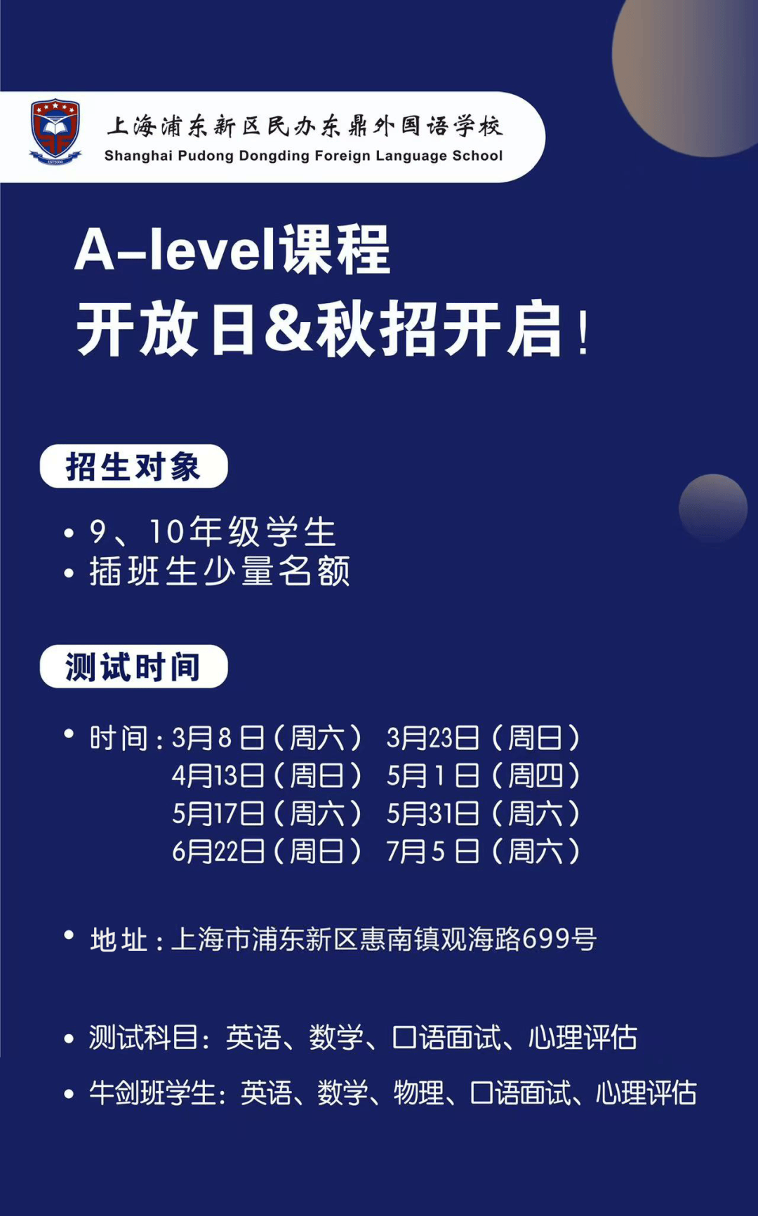 上海市浦东新区惠南镇观海路699号(东校门)